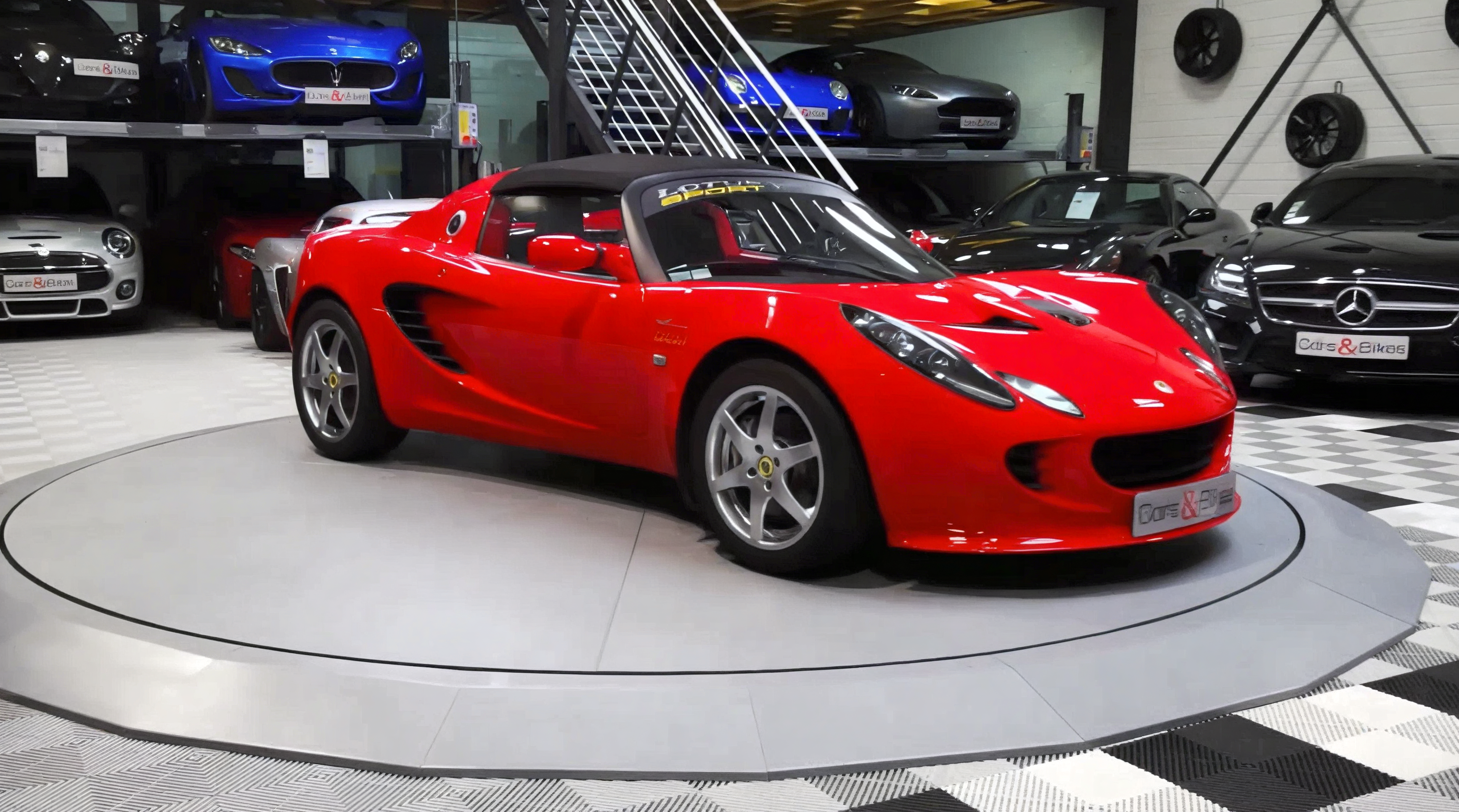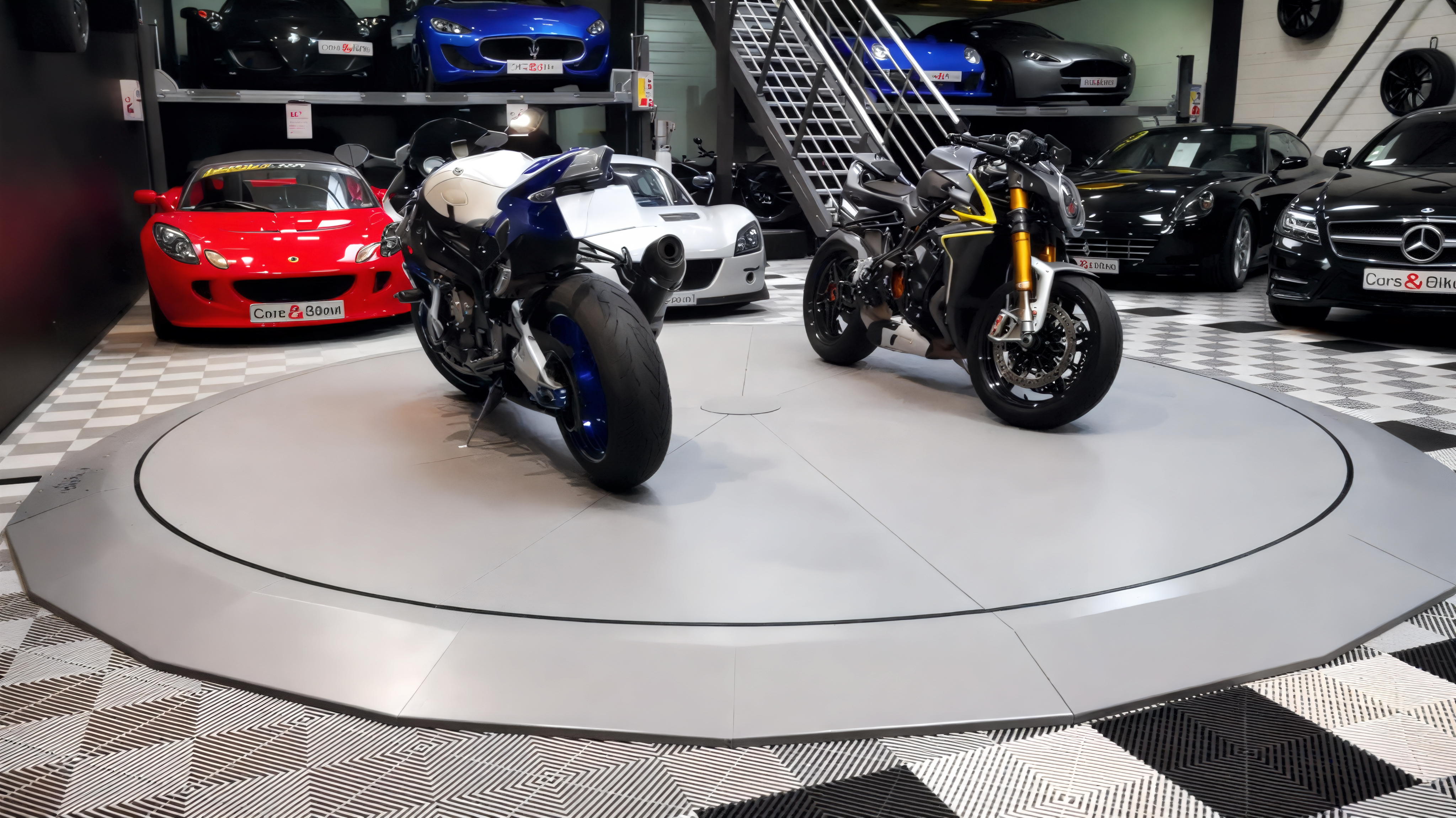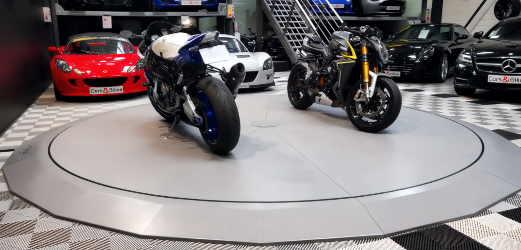 Retour aux réalisations Voiture Moto Garage Livraison et pose d’un plateau tournant motorisé chez Car&Bikes